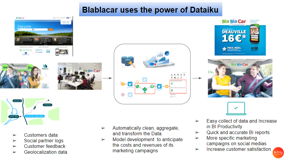 Dans le secteur du transport, BlaBlaCar a utilisé Dataiku dans le but d’anticiper les coûts et revenus de ses campagnes marketing et pour automatiser les requêtes et la génération des rapports quotidiens pour les équipes Marketing.