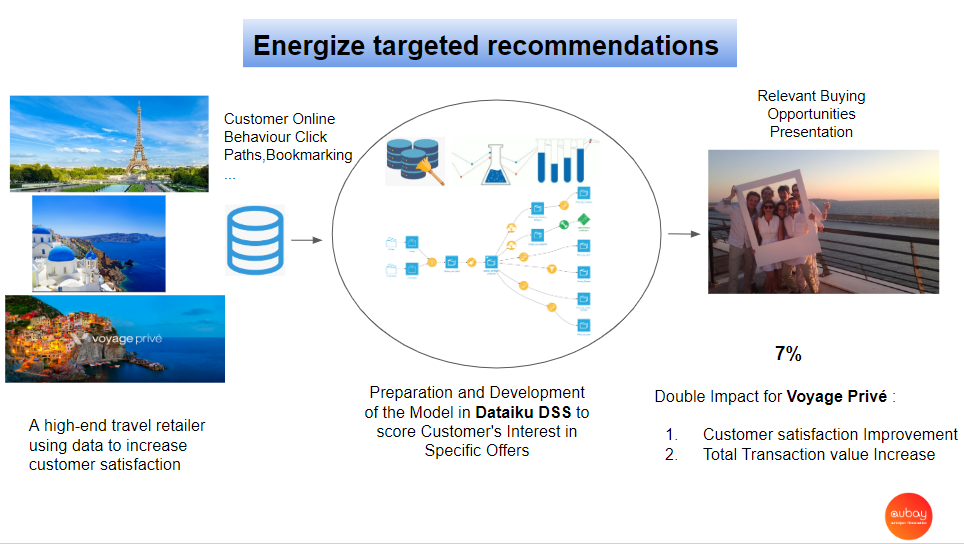 Dataiku est également présent dans le secteur du tourisme, à travers le site Voyageprive qui a eu recours à l’utilisation de la plateforme Dataiku en vue d’améliorer l’expérience client, à travers une analyse approfondie des données massives des utilisateurs permettant de comprendre leurs besoins et ainsi proposer aux clients des recommandations propices et personnalisées. Ceci a eu un impact positif sur le business, avec une amélioration de la satisfaction client, et une augmentation significative de la valeur globale de la transaction comme le montre l’infographie suivante.
