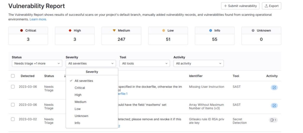 Figure 2 : dashboard Gitlab des différentes vulnérabilités remontés par les scanners