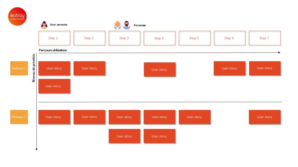 Le Story Mapping est un outil permettant de visualiser et de prioriser nos hypothèses. Il s’agit donc d’une matrice de fonctionnalités, qu’on va prioriser sous des étapes chronologiques qui illustrent le parcours ou l’expérience des utilisateurs de nos produits.