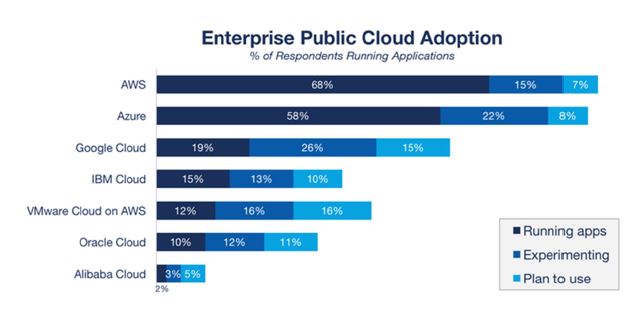 Comme le montre le graphe, le Cloud le plus adopté est AWS car il est LE précurseur du Cloud. Ensuite vient Azure qui essaie de rattraper son retard en proposant une interface plus métier par rapport à AWS et Google Cloud essayant d’être le plus transparent en terme de prix par rapport à ses concurrents.