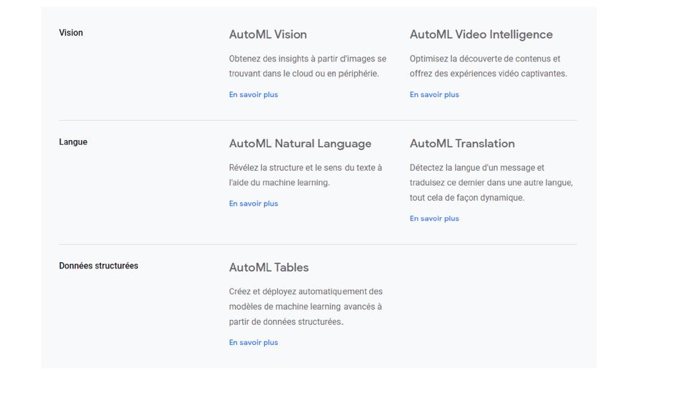 AutoML est disponible pour plusieurs disciplines de I’IA :