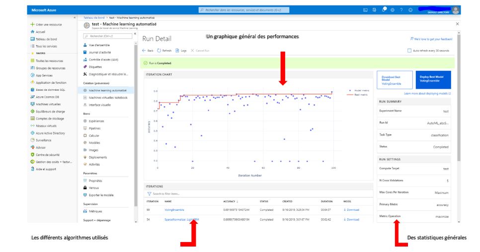 L’Automated Machine Learning permet de créer une IA automatiquement sans coder, il suffit simplement de rassembler un dataset et I’outil choisira I’aIgorithme le plus optimisé pour traiter celui-ci. II montre ensuite tous les algorithmes testés, les performances de ces derniers et des graphiques résumant le tout.