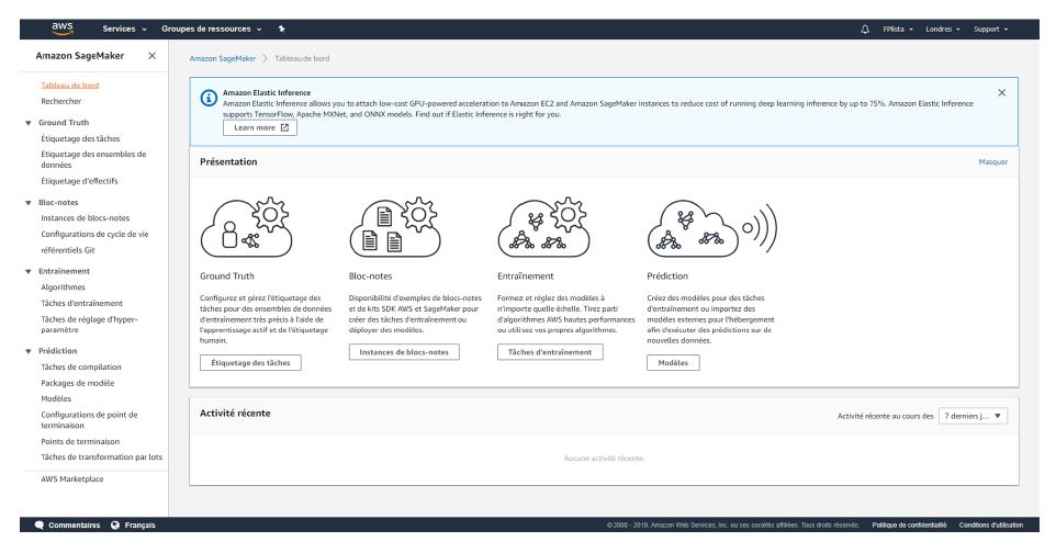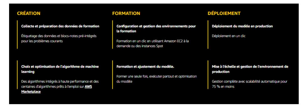 Amazon SageMaker est un service entièrement géré qui couvre l’ensemble du flux de travail de Machine Learning pour étiqueter et préparer les données, choisir un algorithme, former le modèle, l’ajuster et l’optimiser pour le déploiement, effectuer des prévisions et prendre des mesures.